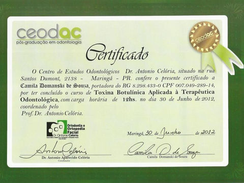 Confira alguns certificados e diplomas conquistados ao longo dos anos pela Dra. Camila Domanski: